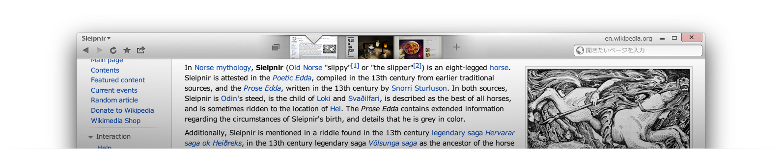 ウィキペディアや Amazon など、様々なウェブサイト上にある検索フィールドを Sleipnir に追加できます。